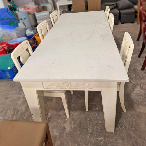 - Mô tả: Bộ bàn ăn cũ gồm 1 bàn mặt đá dài và 6 ghế gỗ sơn trắng cùng họa tiết hoa văn trang trí tinh tế. Mặt bàn đá dày dặn, sạch sẽ, dễ lau chùi, chịu lực tốt. Chân bàn và ghế đều làm từ gỗ sơn PU trắng nhã nhặn, thiết kế bo tròn nhẹ ở lưng ghế tạo cảm giác thoải mái khi ngồi lâu. Kiểu dáng phù hợp cho gia đình đông người hoặc dùng trong nhà hàng, quán ăn cao cấp. Bề mặt bàn rộng rãi, thoải mái cho bữa ăn 6–8 người.