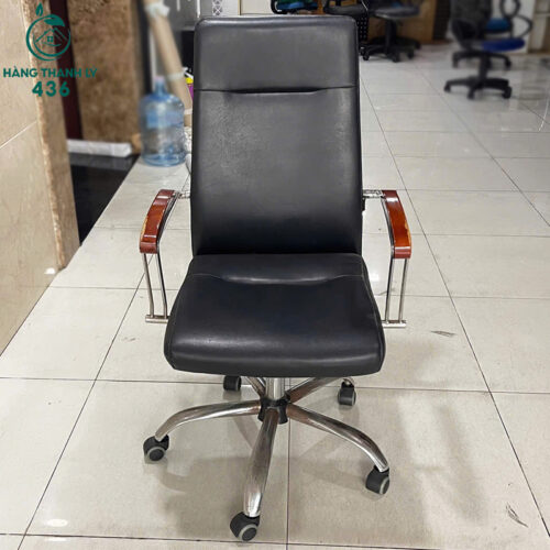 - Mô Tả: Ghế xoay văn phòng bọc da màu đen, thiết kế tựa lưng cao, kiểu dáng hiện đại và thanh thoát. Tay vịn gỗ tự nhiên uốn cong nhẹ giúp thao tác thoải mái, tăng tính thẩm mỹ. Chân ghế inox sáng bóng, có bánh xe xoay 360 độ tiện di chuyển và cần nâng hạ điều chỉnh độ cao phù hợp với mọi vóc dáng. Đệm ngồi êm ái, bề mặt da mềm, dễ lau chùi.