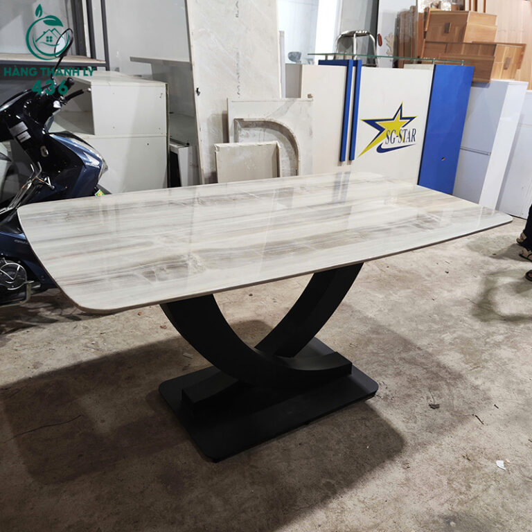 Mô Tả: Chiếc bàn mặt đá này là điểm nhấn đẳng cấp cho phòng ăn hoặc khu vực tiếp khách của bạn. Mặt bàn được làm từ vật liệu giả đá (hoặc đá tự nhiên) có vân đẹp mắt, mang lại vẻ ngoài sang trọng và mát mẻ, đồng thời rất dễ vệ sinh, chống trầy xước và chịu nhiệt tốt. Thiết kế chân bàn bằng sắt uốn cong hình trụ độc đáo, sơn tĩnh điện màu đen, tạo sự vững chãi và tính thẩm mỹ cao, khác biệt so với các mẫu bàn truyền thống. Đây là lựa chọn lý tưởng cho các gia đình hiện đại hoặc quán cafe/nhà hàng cao cấp.