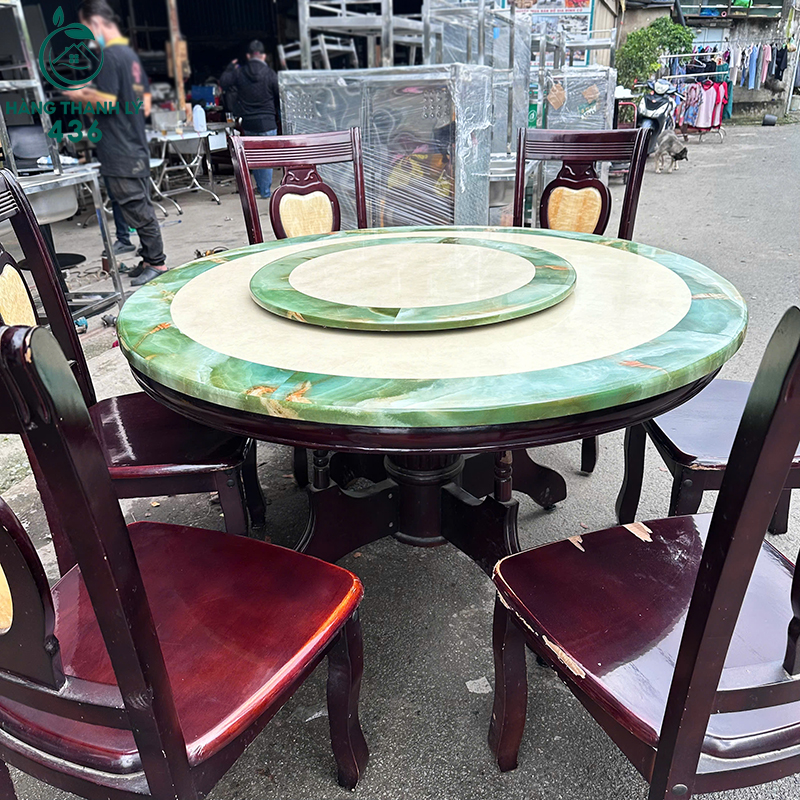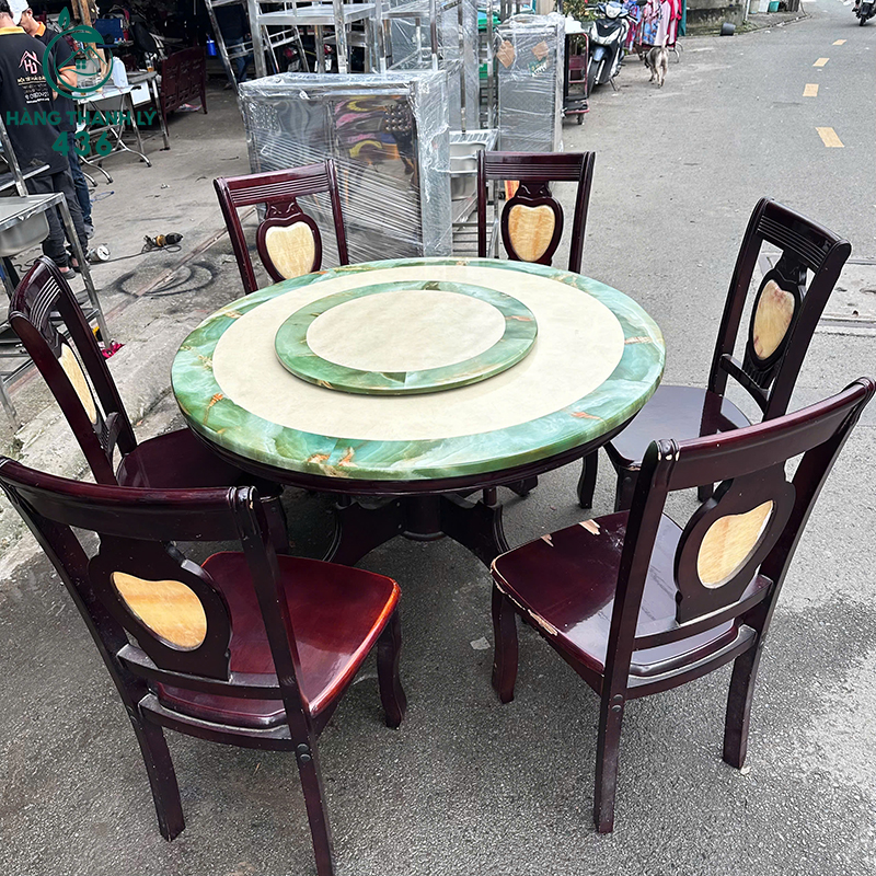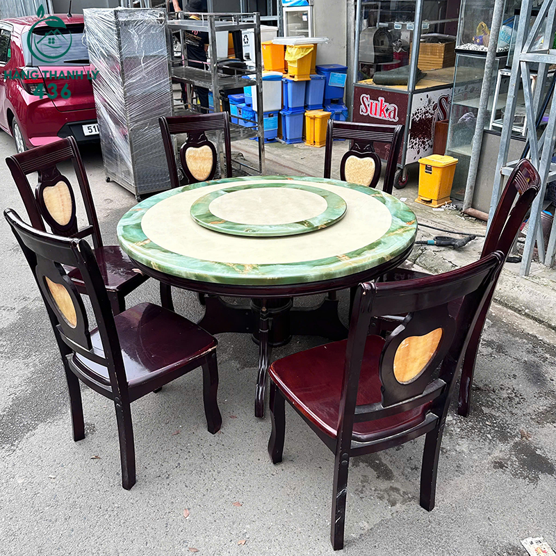 - Mô Tả: Bộ bàn ăn tròn mặt đá xoay này gồm 1 bàn lớn và 6 ghế gỗ, phù hợp cho gia đình đông người hoặc không gian tiếp khách sang trọng. Mặt bàn bằng đá marble phối màu xanh be độc đáo, có mâm xoay tiện lợi khi dùng món chung. Ghế gỗ tự nhiên chắc chắn, lưng ghế có họa tiết hình tim nhẹ nhàng, tạo điểm nhấn tinh tế. Thiết kế tổng thể hài hòa, dễ phối với nội thất cổ điển hoặc hiện đại. Bàn rộng rãi, dễ vệ sinh, dùng lâu vẫn bền đẹp.
