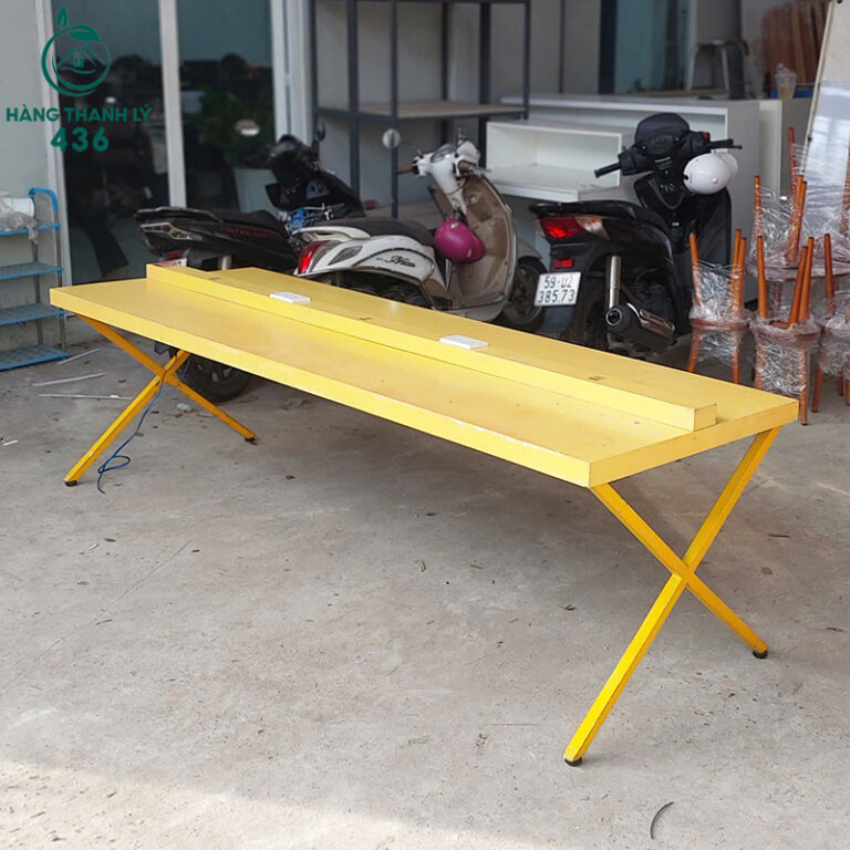 Mô Tả: Mẫu bàn dài màu vàng này mang đến vẻ ngoài tươi mới, nổi bật cho không gian quán cafe của bạn. Với chiều dài lớn, bàn có thể phục vụ nhiều khách cùng lúc hoặc làm bàn trưng bày sản phẩm. Điểm cộng lớn là chân bàn bằng sắt có thể gập gọn theo hình chữ X, giúp bạn dễ dàng di chuyển, lưu trữ khi không cần dùng đến, rất thích hợp cho các không gian cần sự linh hoạt. Bàn có độ bền cao, mặt bàn phẳng, chống trầy xước và dễ dàng lau sạch mọi vết bẩn sau khi sử dụng.