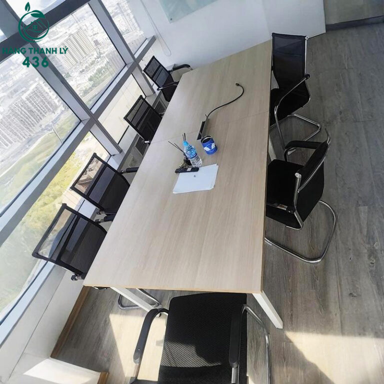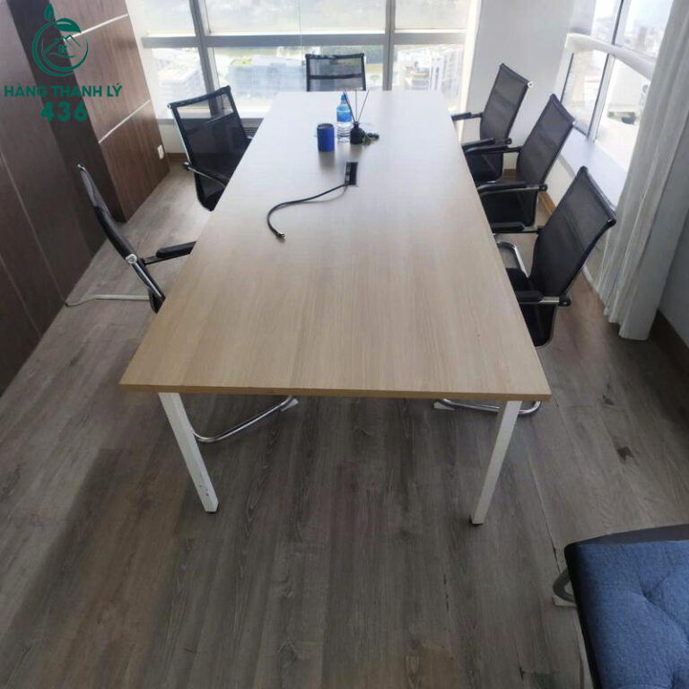Mô Tả: Mẫu bàn họp này thiết kế dạng dài, mặt bàn rộng rãi, phù hợp cho phòng họp công ty, phòng làm việc nhóm hoặc không gian trao đổi chung. Bàn đủ chỗ cho nhiều người ngồi, thuận tiện đặt laptop, tài liệu và thiết bị họp. Kiểu dáng đơn giản, màu gỗ sáng tạo cảm giác hiện đại, dễ phối với ghế văn phòng và không gian làm việc chuyên nghiệp. Khung chân chắc chắn, bàn đứng vững khi sử dụng lâu dài. Sản phẩm đã qua sử dụng nhưng còn mới khoảng 90%, bề mặt còn đẹp, sử dụng ổn định và giúp tiết kiệm chi phí đầu tư so với mua mới.