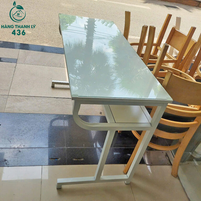 - Mô Tả: Chiếc bàn có thiết kế thanh thoát, hiện đại với khung sắt sơn tĩnh điện màu trắng và mặt bàn kính cường lực phủ lớp men bóng, tạo hiệu ứng phản chiếu sang trọng. Kiểu dáng hình chữ nhật dài, kết hợp cùng chân bàn dạng chữ T ngược chắc chắn, phù hợp cho không gian hẹp như quán cà phê, quán trà sữa, khu vực làm việc cá nhân hoặc khu vực tiếp khách nhỏ. Mặt kính dễ lau chùi, chống trầy xước nhẹ, mang lại cảm giác sạch sẽ và sáng sủa cho tổng thể không gian. Đặc biệt, thiết kế còn tích hợp thêm ngăn nhỏ bên dưới mặt bàn tiện lợi để cất gọn vật dụng cá nhân.