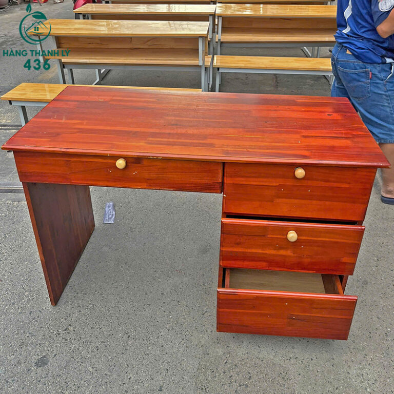 - Mô Tả: Chiếc bàn làm việc này rất phù hợp cho những ai cần một không gian làm việc hoặc học tập riêng tư và gọn gàng. Bàn có mặt gỗ tự nhiên dày dặn, màu đỏ nâu sang trọng, tạo cảm giác ấm cúng cho căn phòng. Thiết kế bàn đi kèm với tổng cộng bốn ngăn kéo tiện lợi, giúp bạn sắp xếp sách vở, tài liệu và dụng cụ cá nhân một cách ngăn nắp, dễ tìm kiếm. Độ cao bàn tiêu chuẩn, đảm bảo bạn có tư thế ngồi thoải mái, hạn chế mỏi lưng khi làm việc lâu. Sở hữu chiếc bàn gỗ cũ chất lượng này là một khoản đầu tư thông minh, tiết kiệm chi phí.