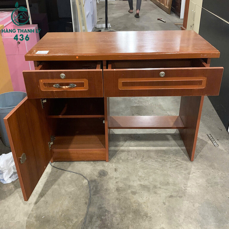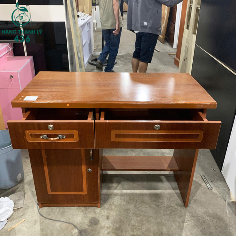 - Mô Tả: Chiếc bàn này là lựa chọn tối ưu cho không gian làm việc hoặc học tập cá nhân. Thiết kế cổ điển, quen thuộc với màu vân gỗ nổi bật, mang lại cảm giác ấm cúng và chuyên nghiệp. Bàn tích hợp đầy đủ công năng với ngăn kéo có khóa để cất giữ tài liệu quan trọng, một hộc mở tiện lợi để đặt sách vở hoặc thiết bị, và một tủ cánh kín giúp bảo quản vật dụng lớn hơn, tránh bụi bẩn. Mặt bàn rộng rãi, đủ chỗ đặt laptop và các tài liệu cần thiết. Chiếc bàn cũ này đảm bảo sự chắc chắn, độ bền cao, giúp bạn tiết kiệm chi phí mà vẫn có được không gian làm việc hiệu quả.