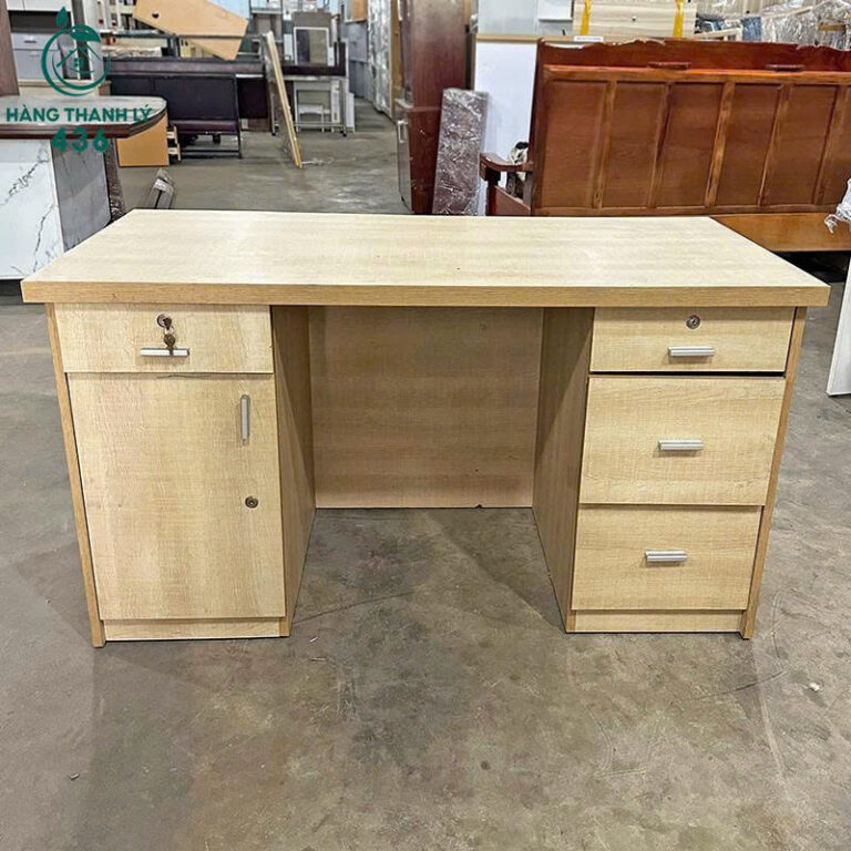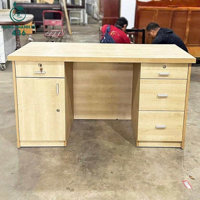 - Mô Tả: Trang bị cho góc làm việc của bạn một chiếc bàn đa năng và gọn gàng với mẫu bàn nhân viên thanh lý này. Với mặt bàn rộng rãi, bạn có đủ không gian để đặt máy tính và sắp xếp tài liệu một cách khoa học. Bàn được thiết kế thông minh với hai cụm hộc tủ liền hai bên. Phía trái bao gồm một ngăn kéo và một hộc tủ có cánh, cả hai đều có khóa riêng giúp bạn lưu trữ vật dụng quan trọng. Phía phải là ba ngăn kéo tiện lợi để phân loại đồ dùng văn phòng. Màu gỗ sồi sáng đẹp, dễ dàng phối hợp với các nội thất khác.