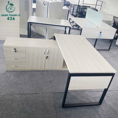 - Mô tả: Bộ bàn làm việc góc L cũ này sở hữu thiết kế hiện đại và tinh tế. Mặt bàn được làm từ chất gỗ bền đẹp, sáng màu tạo cảm giác rộng rãi, thoáng đãng cho không gian làm việc. Cấu trúc chân bàn bằng sắt sơn tĩnh điện đen mang lại sự vững chãi và tạo điểm nhấn ấn tượng. Kèm theo đó là tủ tài liệu liền kề với nhiều ngăn kéo tiện dụng, giúp bạn sắp xếp đồ đạc gọn gàng và khoa học hơn.