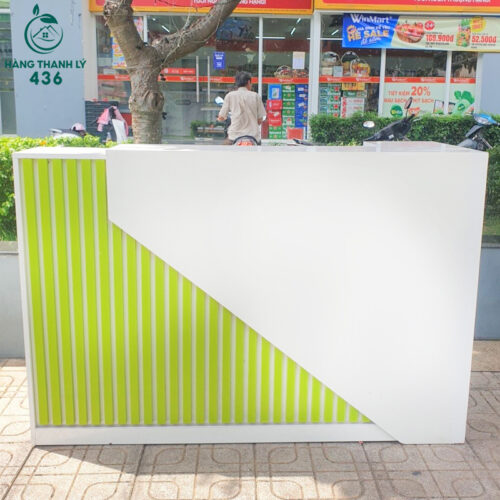 - Mô tả: Bàn lễ tân còn như mới. Sản phẩm có màu tone màu trắng là chủ đạo kết hợp những đường nét xanh, tạo nên một tổng thể hài hòa. Màu sắc phù hợp với nhiều không gian khác nhau. Sản phẩm tạo nên một không gian hiện đại, chuyên nghiệp. Chất liệu làm từ gỗ công nghiệp bền, đẹp. Bên trong bàn có 3 hộc tủ có trang bị ổ khóa để sắp xếp vật dụng ngăn nắp.