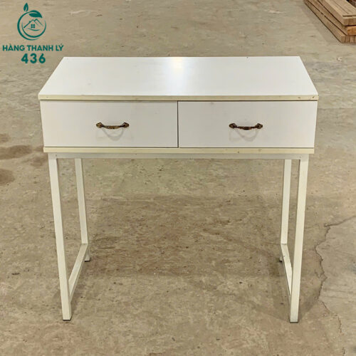 - Mô tả: Bàn gỗ cũ thiết kế nhỏ gọn với 2 ngăn kéo tiện dụng, phù hợp dùng làm bàn làm việc tại nhà, bàn trang điểm hoặc bàn phụ để đồ. Mặt bàn vuông vức, màu trắng dễ phối nội thất, phần chân làm từ sắt sơn tĩnh điện bền và chịu lực tốt. Tay nắm kim loại cổ điển tạo điểm nhấn nhẹ nhàng. Kết cấu tổng thể chắc chắn, không chiếm nhiều diện tích, dễ di chuyển và sử dụng linh hoạt trong nhiều không gian nhỏ.
