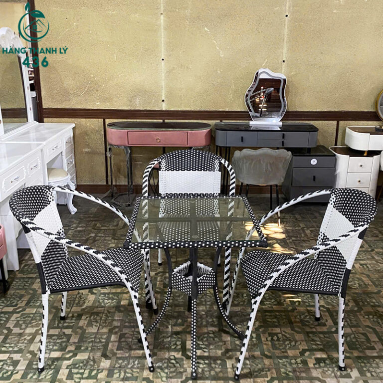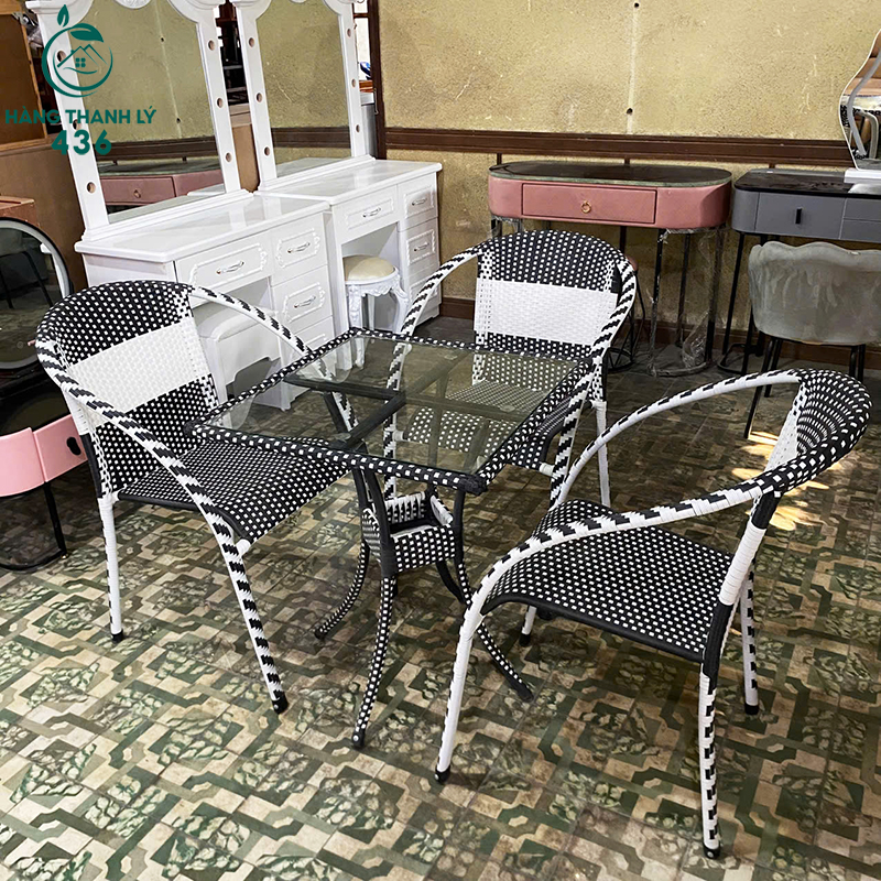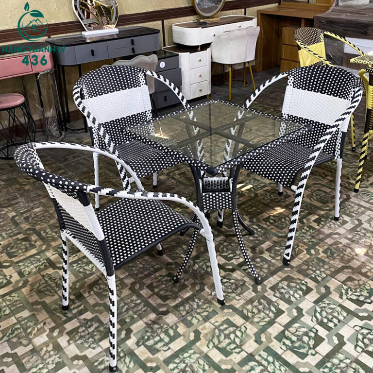 Mô Tả: Bộ sản phẩm sở hữu thiết kế tinh tế với sự kết hợp đối lập giữa hai tông màu trắng và đen, tạo nên vẻ ngoài hiện đại và sạch sẽ cho không gian quán. Ghế được đan từ sợi mây nhựa cao cấp, có độ đàn hồi tốt và không bị chùn giãn sau thời gian dài sử dụng. Phần lưng tựa và tay vịn được thiết kế bo cong mềm mại, mang lại cảm giác thoải mái tối đa cho người ngồi. Bàn đi kèm có mặt kính cường lực chắc chắn, vừa tăng thẩm mỹ vừa giúp việc vệ sinh nước tràn hay bụi bẩn trở nên nhanh chóng. Khung sắt sơn tĩnh điện bên trong giúp bộ bàn ghế chịu được tải trọng lớn và thích nghi tốt với môi trường ngoài trời hoặc bán lộ thiên.