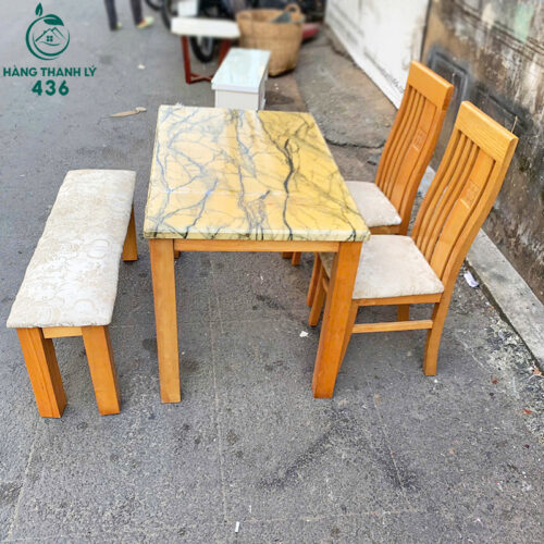 - Mô tả: Bộ bàn ăn gồm 1 bàn mặt đá vân vàng tự nhiên, 2 ghế tựa gỗ kèm nệm bọc vải họa tiết và 1 băng ghế dài có đệm. Mặt bàn bằng đá chắc chắn, sáng bóng, dễ lau chùi, chịu lực tốt và hạn chế trầy xước. Khung bàn và ghế được làm từ gỗ đảm bảo độ bền cao, không cong vênh, mối mọt. Ghế có thiết kế tựa lưng cao, mang lại cảm giác thoải mái khi ngồi lâu. Băng ghế dài đi kèm giúp tối ưu không gian, phù hợp cho gia đình hoặc quán ăn cần thêm chỗ ngồi linh hoạt. Màu sắc vân đá vàng kết hợp với gỗ tự nhiên tạo cảm giác ấm cúng, sang trọng.