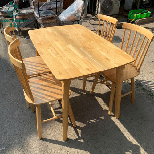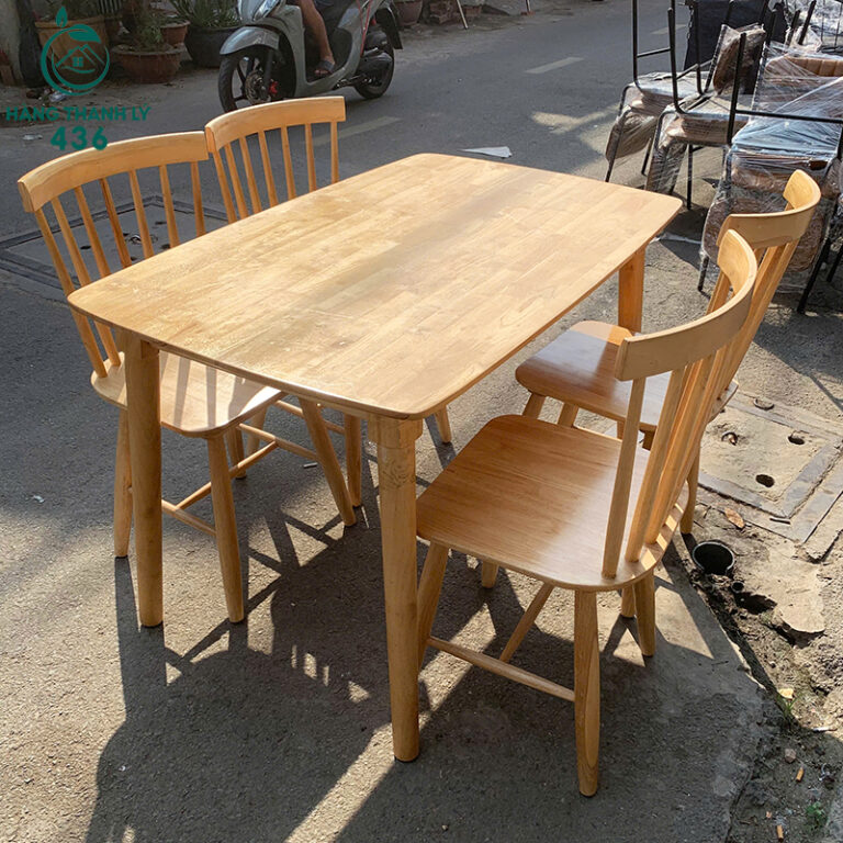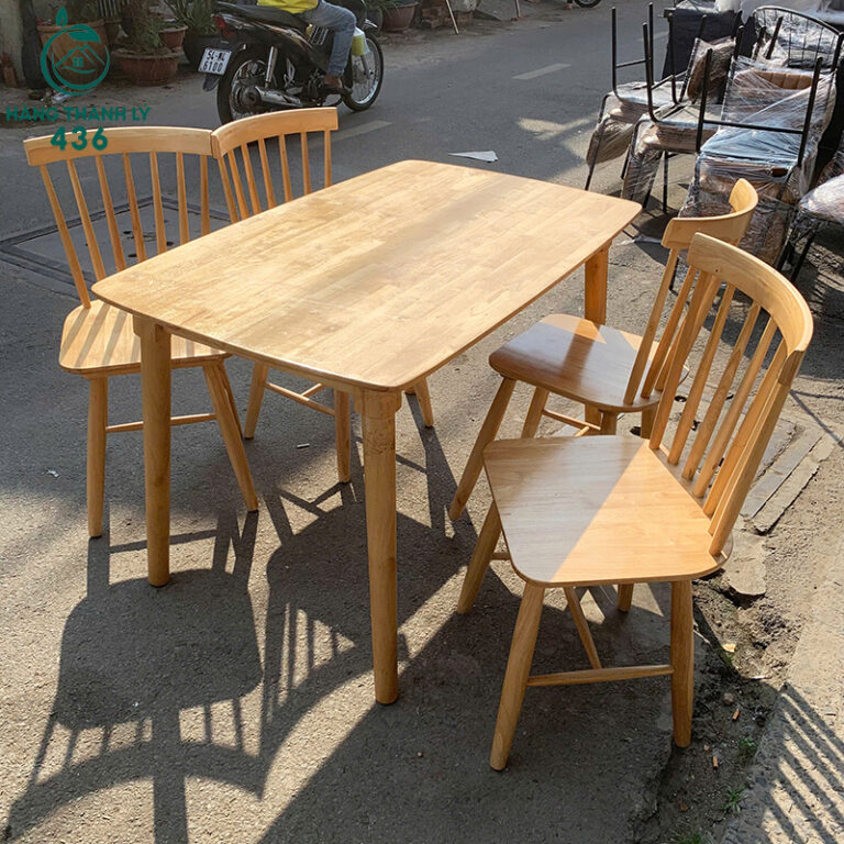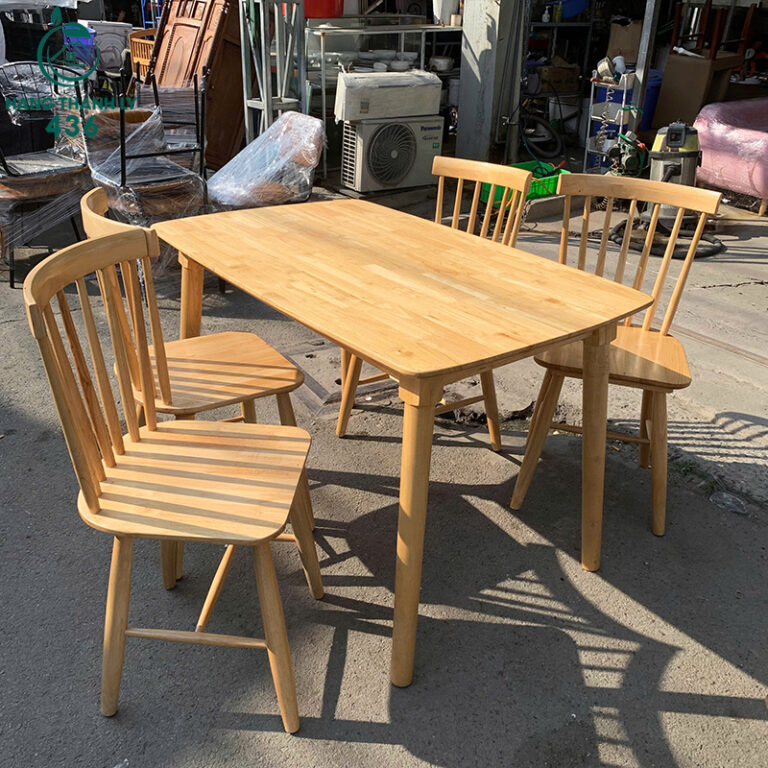Mô Tả: Bộ bàn ăn cũ gồm 1 bàn gỗ và 4 ghế đồng bộ, thiết kế vuông vức, kích thước vừa phải, phù hợp không gian bếp hoặc phòng ăn gia đình. Mặt bàn gỗ phẳng, các góc bo nhẹ giúp sử dụng an toàn và dễ vệ sinh sau bữa ăn. Ghế gỗ nan lưng tạo cảm giác ngồi chắc chắn, thoáng lưng, dùng lâu không bị bí. Kiểu dáng mộc mạc, dễ kết hợp với nhiều phong cách nội thất khác nhau. Hàng đã qua sử dụng nhưng còn chắc chắn, phù hợp nhu cầu ăn uống sinh hoạt hằng ngày, giúp tiết kiệm chi phí so với mua mới.