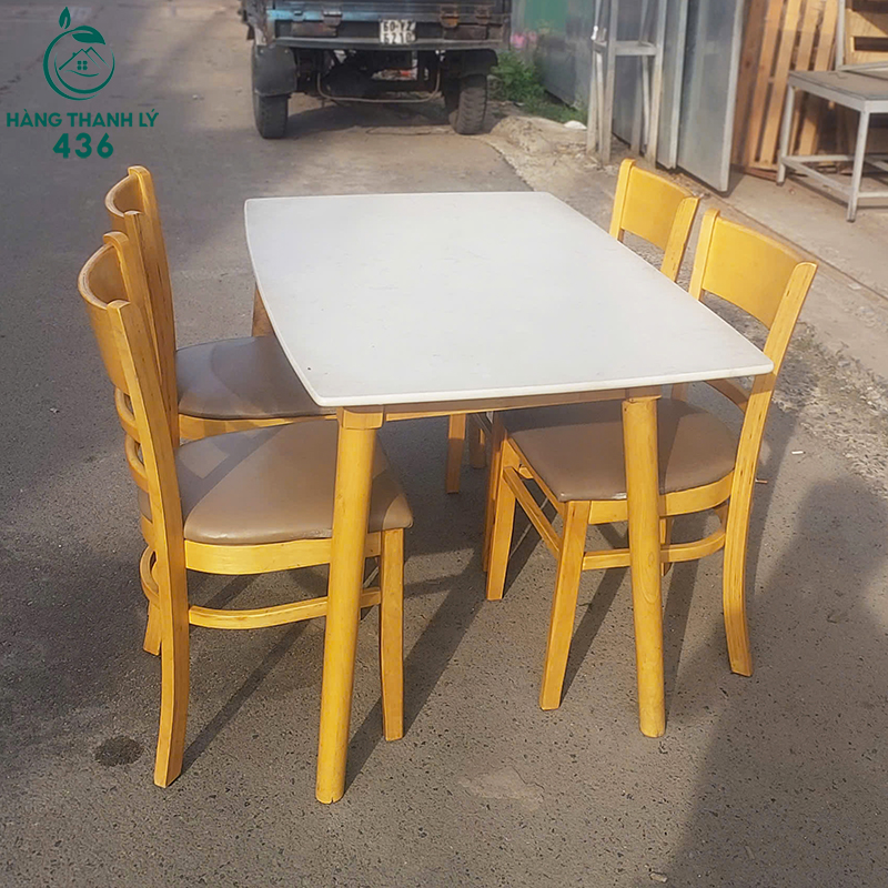 Mô Tả: Bộ bàn ăn 4 ghế này mang phong cách hiện đại, tối giản, là điểm nhấn ấm cúng cho không gian bếp hoặc phòng ăn nhà bạn. Mặt bàn được làm bằng đá nhân tạo hoặc gỗ phủ laminate màu trắng sáng bóng, chống thấm và chống trầy xước rất tốt, dễ dàng lau chùi sau bữa ăn. Ghế được làm từ khung gỗ tự nhiên màu vàng nhạt, thiết kế tựa lưng cong nhẹ tạo sự thoải mái, đệm ngồi bọc da êm ái. Kích thước bàn 1m2 vừa vặn, không chiếm quá nhiều diện tích. Mua bộ bàn ăn thanh lý này giúp bạn có được sản phẩm chất lượng, bền đẹp với chi phí tiết kiệm tối đa.