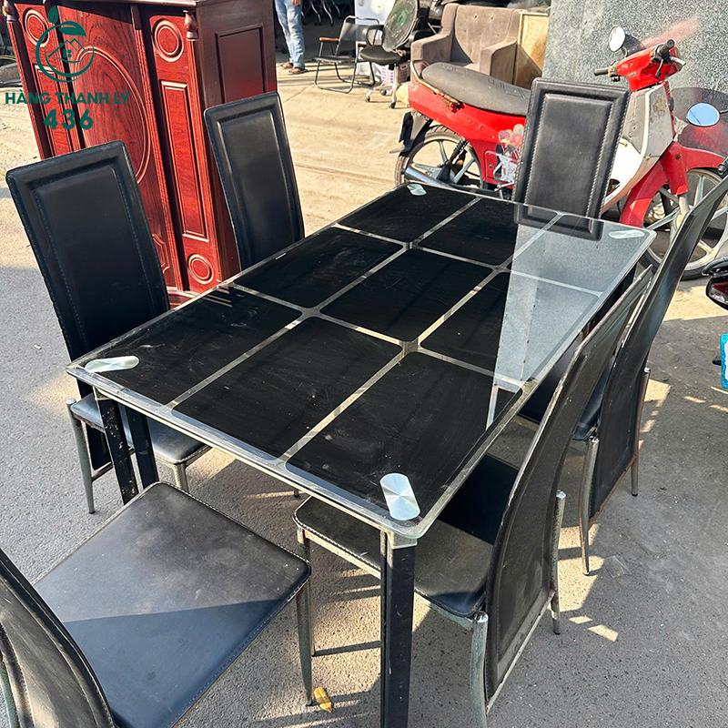 Mô Tả: Bộ bàn ăn 6 ghế này là sự lựa chọn hoàn hảo cho không gian bếp hoặc phòng ăn có diện tích vừa và lớn. Mặt bàn làm từ kính cường lực màu đen, không chỉ tạo vẻ đẹp sang trọng, hiện đại mà còn dễ dàng lau chùi, vệ sinh sau mỗi bữa ăn. Ghế được bọc đệm màu đen, mang lại cảm giác êm ái, thoải mái khi ngồi. Khung bàn và ghế đều làm bằng kim loại, đảm bảo độ vững chắc và tuổi thọ lâu dài. Dù là hàng thanh lý, bộ bàn ghế này vẫn giữ được vẻ ngoài đẹp và chất lượng tốt, giúp gia đình bạn có nơi sum họp ấm cúng với chi phí hợp lý.