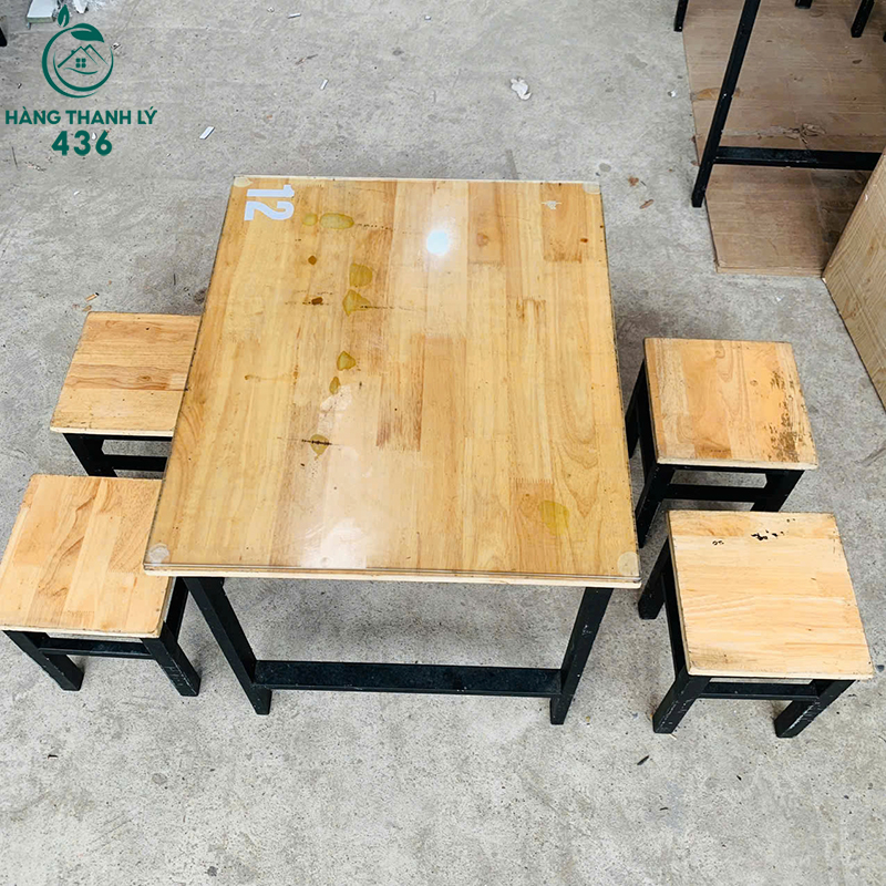 Mô Tả: Bộ bàn ăn 4 ghế đôn này là lựa chọn cực kỳ tiết kiệm và tiện lợi cho không gian nhỏ hẹp như phòng trọ, căn hộ mini, hoặc các quán ăn vỉa hè. Bàn có kích thước nhỏ gọn (khoảng 55cm x 65cm, cao 60cm), mặt bàn bằng gỗ sáng màu và được phủ một lớp kính bên trên, giúp chống trầy xước và dễ dàng lau chùi dầu mỡ. Khung bàn và ghế đôn được làm từ sắt hoặc gỗ sơn màu đen, tạo độ chắc chắn. Ghế đôn không tựa, có thể cất gọn gàng dưới gầm bàn. Mua bộ bàn ăn thanh lý này giúp bạn giải quyết nhu cầu sử dụng cơ bản với chi phí đầu tư tối thiểu.