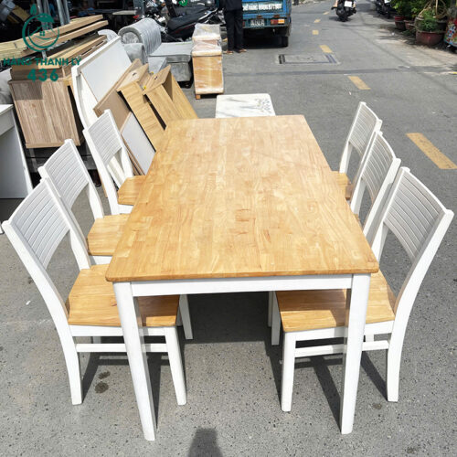 - Mô Tả: Bộ bàn ăn gồm một bàn lớn và sáu ghế, với thiết kế thanh lịch và hiện đại, bàn có mặt gỗ tự nhiên màu sáng, kết hợp với khung gỗ sơn trắng, mang lại cảm giác tươi mới và dễ dàng phối hợp với nhiều kiểu trang trí nội thất. Các ghế có tựa lưng thiết kế đơn giản, với phần ngồi cũng làm từ gỗ tự nhiên, tạo sự thoải mái cho người sử dụng. Bộ bàn ghế này không chỉ thích hợp cho không gian phòng ăn mà còn phù hợp với phòng bếp hoặc không gian sinh hoạt chung. Với chất liệu gỗ chắc chắn và kiểu dáng tối giản, bộ bàn ăn này mang lại sự tiện nghi và vẻ đẹp sang trọng cho không gian sống của bạn.