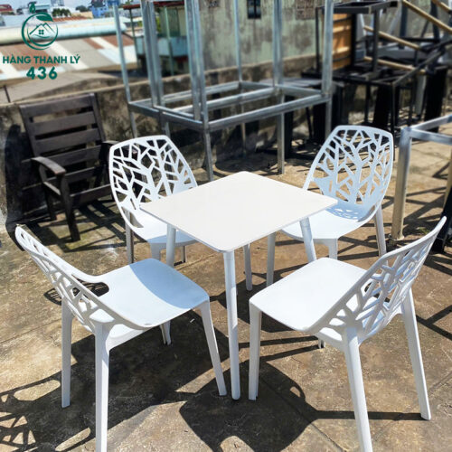 - Mô tả: Bộ bàn ghế cũ gồm 1 bàn vuông và 4 ghế nhựa, thiết kế hiện đại và bền đẹp. Ghế nhựa có lưng tựa kiểu dáng hình lá độc đáo, tạo cảm giác thoải mái khi ngồi và phù hợp với nhiều không gian khác nhau như quán cafe, sân vườn hoặc ban công. Bàn được làm từ chất liệu nhựa chắc chắn, chân vững chãi, đảm bảo độ bền và sự ổn định khi sử dụng. Bộ bàn ghế này không chỉ mang đến tính tiện dụng mà còn tạo điểm nhấn thẩm mỹ cho không gian của bạn.
