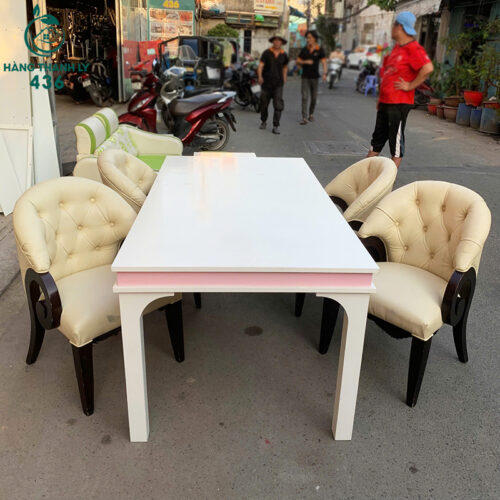 Bộ Bàn Ghế Ăn Cũ 1M8X90CM Bọc Da Màu Kem Lưng Cao