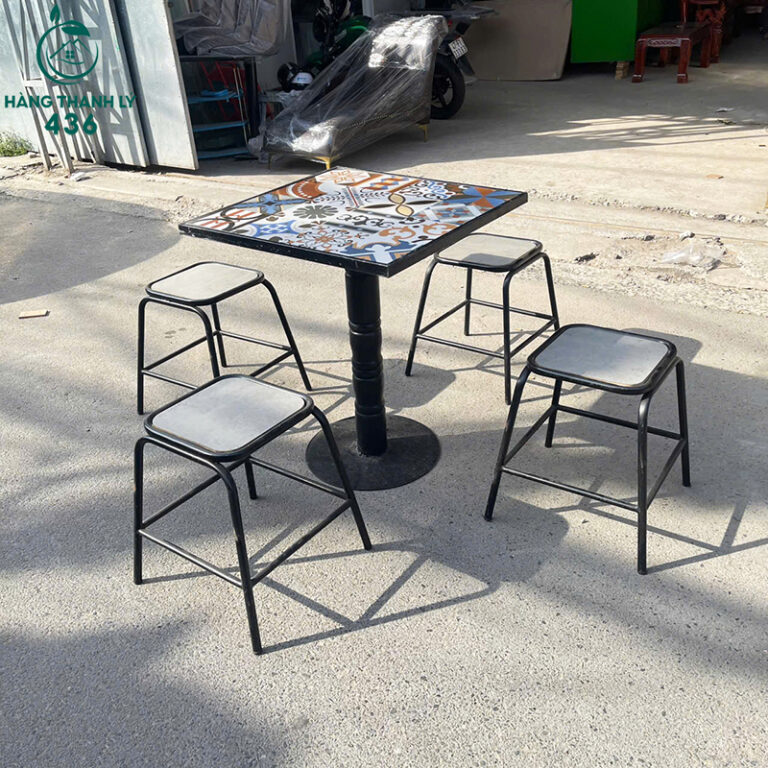 Mô Tả: Bộ bàn ghế cafe này gồm 1 bàn vuông mặt gạch hoa văn và 4 ghế sắt đồng bộ, thiết kế đơn giản, gọn gàng, rất phù hợp cho quán cafe, quán nước hoặc khu ngồi ngoài trời. Mặt bàn gạch hoa văn tạo điểm nhấn nổi bật, dễ lau chùi và ít bám bẩn khi sử dụng hằng ngày. Ghế khung sắt sơn đen chắc chắn, chịu lực tốt, ngồi ổn định và dễ xếp gọn khi cần dọn dẹp. Kích thước vừa phải, giúp tối ưu diện tích và thuận tiện trong bài trí không gian kinh doanh nhỏ.