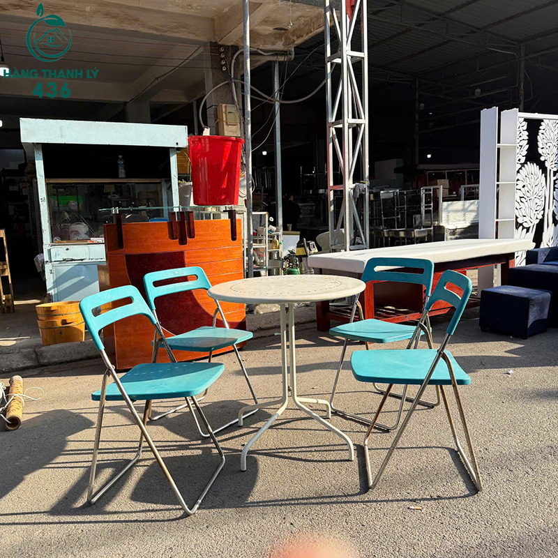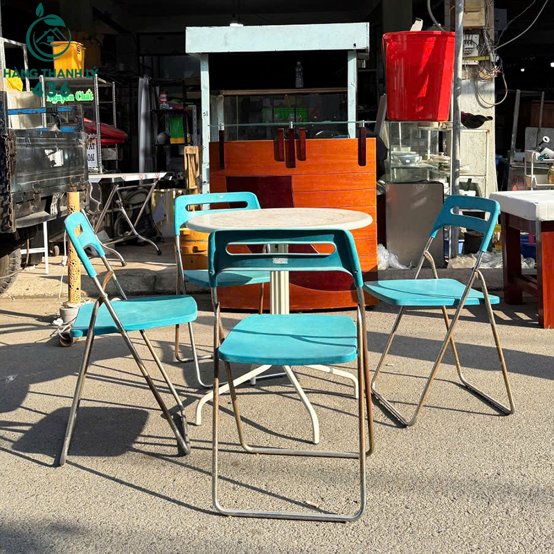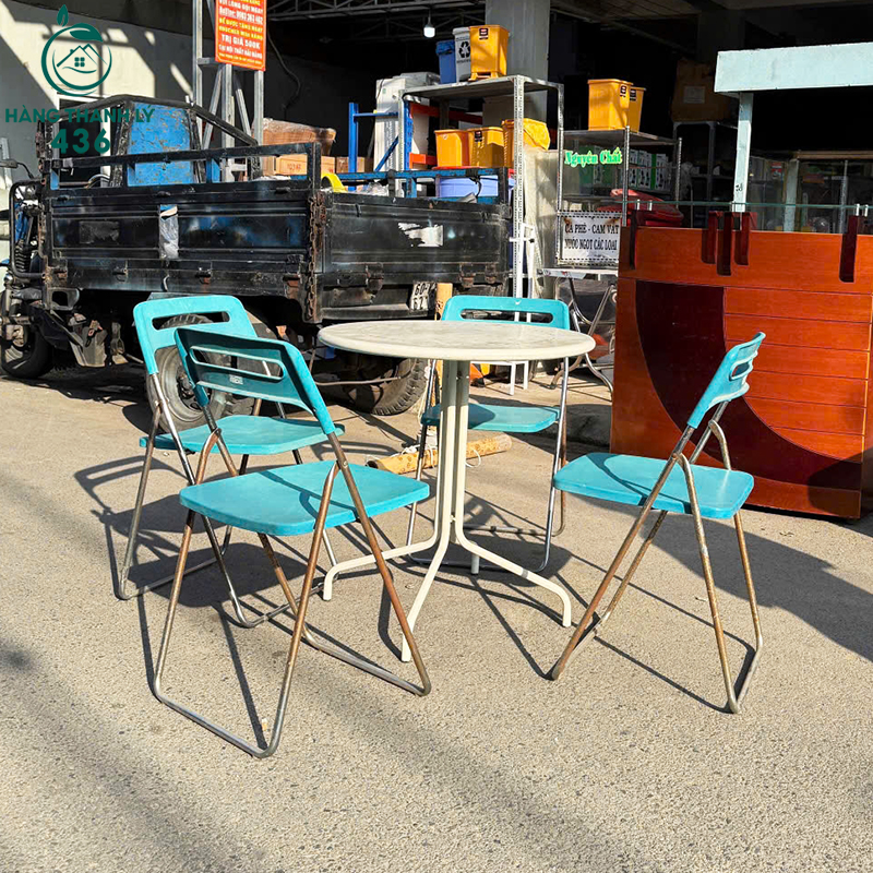 Mô Tả: Bộ bàn ghế cafe cũ này phù hợp sử dụng cho ban công căn hộ, sân thượng, quán cafe nhỏ hoặc không gian ngoài trời cần sự gọn gàng. Bàn tròn kích thước vừa phải, mặt bàn thoáng dễ lau chùi, kết hợp cùng ghế xếp giúp sắp xếp linh hoạt khi sử dụng. Ghế ngồi chắc chắn, tựa lưng thoải mái, phù hợp ngồi uống cafe, ăn nhẹ hoặc thư giãn mỗi ngày. Khung sắt chịu lực tốt, dùng ổn định trong thời gian dài. Màu sắc trẻ trung tạo điểm nhấn cho không gian, thích hợp cho khách cần bộ bàn ghế đơn giản với chi phí tiết kiệm.