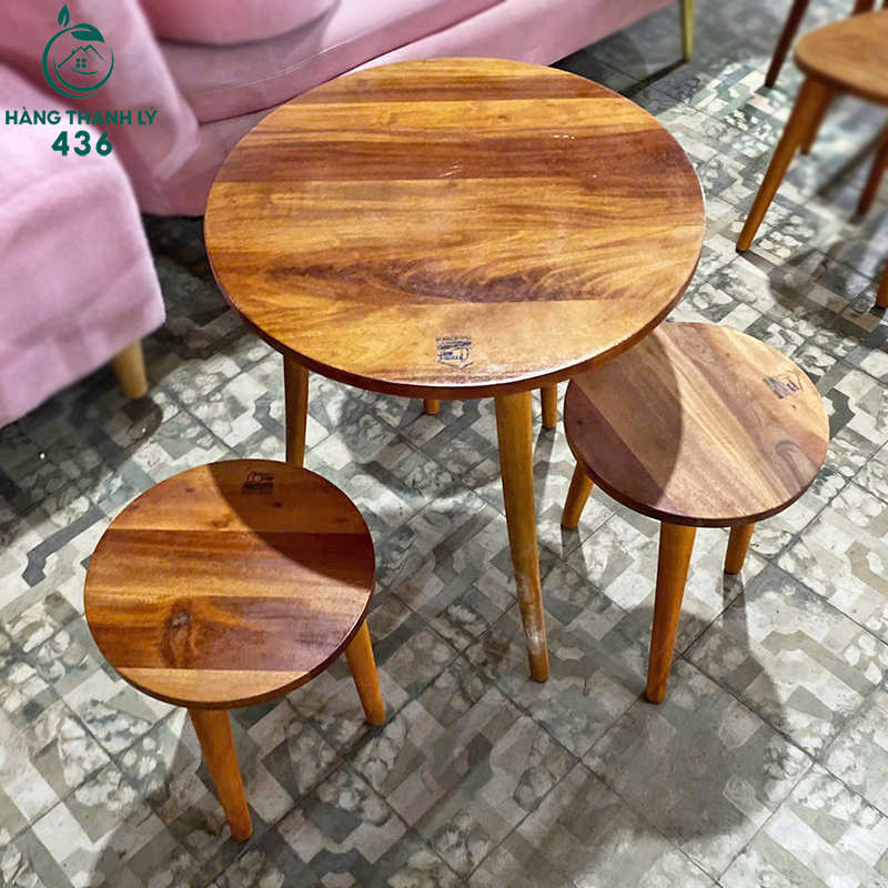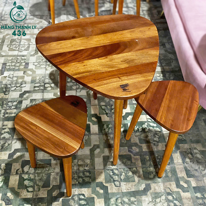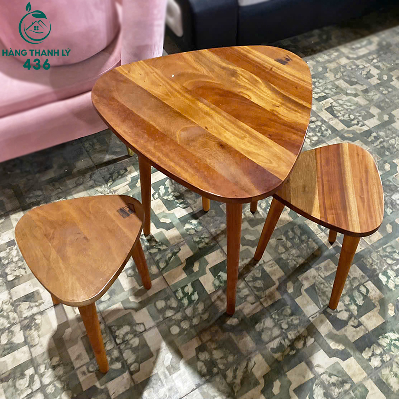 - Mô tả: Bộ gồm 1 bàn tam giác 3 chân và 3 ghế tròn nhỏ, thích hợp sử dụng cho quán cà phê, trà sữa, sân vườn hoặc trang trí góc nhà. Thiết kế chân thon gọn, nhẹ dễ di chuyển và bố trí. Bề mặt gỗ láng mịn, giữ được màu vân gỗ tự nhiên, dễ vệ sinh sau khi sử dụng. Combo phù hợp cho những không gian nhỏ hoặc setup bàn riêng cho 3 người.