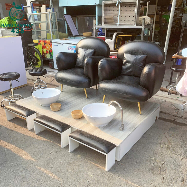 Mô Tả: Sản phẩm là trọn bộ ghế làm nail đôi chuyên nghiệp dành cho các spa và tiệm làm móng muốn nâng cấp không gian với mức giá tiết kiệm. Ghế được bọc chất liệu da màu đen cao cấp, thiết kế dáng phi thuyền bo cong ôm sát cơ thể mang lại cảm giác vô cùng thoải mái cho khách hàng khi sử dụng dịch vụ lâu. Đi kèm là hệ thống bục gỗ chắc chắn, tích hợp sẵn hai chậu sứ trắng và vòi nước inox cao cấp, giúp thao tác ngâm chân và làm móng diễn ra thuận tiện nhất. Chân ghế kim loại mạ vàng không chỉ tạo điểm nhấn sang trọng mà còn đảm bảo độ chịu lực tuyệt vời. Toàn bộ bề mặt da và bục gỗ đều còn rất mới, không bị bong tróc hay trầy xước, đảm bảo tính thẩm mỹ cao cho cửa hàng.