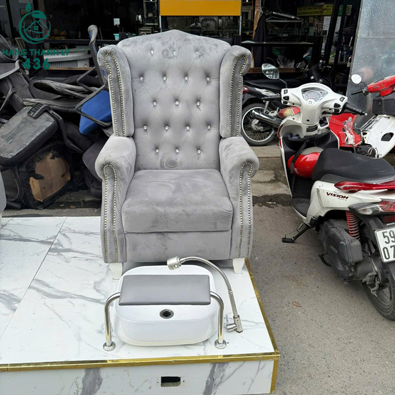 - Mô Tả: Đây là bộ ghế làm nail thanh lý, còn rất mới, tới 90%, giúp nâng tầm không gian tiệm nail hoặc spa của bạn ngay lập tức. Ghế được bọc vải nhung màu xám cực kỳ sang trọng và êm ái, với lưng cao được trang trí bằng nút đính pha lê lấp lánh, mang lại trải nghiệm thoải mái nhất cho khách hàng. Thiết kế đã bao gồm bục và lavabo rửa chân tích hợp, giúp tiết kiệm thời gian lắp đặt và chi phí mua riêng lẻ.
