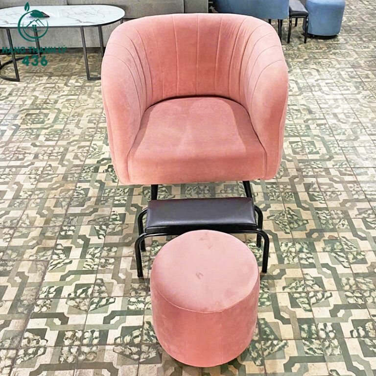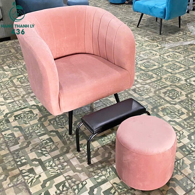 - Mô tả: Bộ ghế làm nail spa gồm 1 ghế salon dáng tròn bo cong, kèm 1 ghế đôn nhỏ và 1 gác chân rời. Ghế chính có phần tựa lưng êm ái, đệm dày, bọc nhung mềm mại cho cảm giác ngồi dễ chịu. Ghế đôn thấp giúp thợ thao tác thuận tiện và linh hoạt, còn gác chân bằng sắt đen bọc simili dễ vệ sinh. Thiết kế gọn gàng, phù hợp cho tiệm nail, spa mini hoặc góc thư giãn tại nhà.