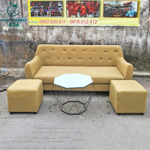 - Chất liệu: Bộ sofa bọc vải, chân gỗ chắc chắn