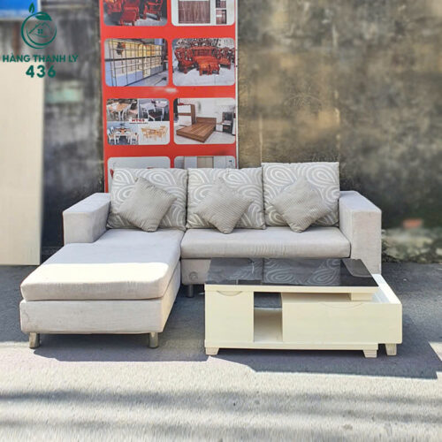 - Mô tả: Bộ sofa góc L cũ với thiết kế hiện đại và tiện dụng, bao gồm ghế sofa lớn bọc vải màu xám nhạt và bàn kính đi kèm. Ghế có kiểu dáng góc L, thích hợp để bố trí trong không gian phòng khách, giúp tiết kiệm diện tích và tạo không gian thoải mái cho gia đình. Đệm ngồi dày dặn, êm ái và có thêm gối tựa tạo điểm nhấn. Bàn kính kết hợp khung gỗ với các ngăn lưu trữ tiện lợi, phù hợp cho việc trang trí hoặc đặt đồ uống.