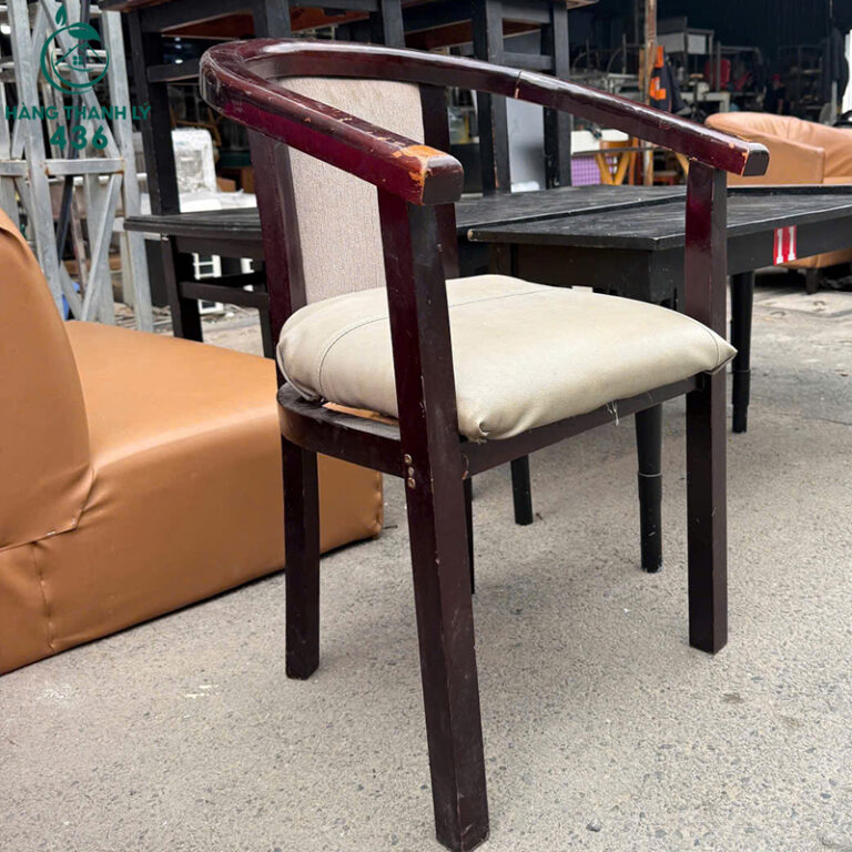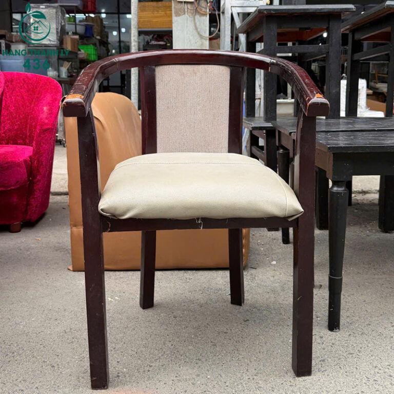 Mô Tả: Ghế cafe gỗ cũ thiết kế tay cong ôm dáng, tạo cảm giác ngồi thoải mái khi trò chuyện hoặc dùng nước lâu. Khung ghế gỗ chắc chắn, dáng ngồi ổn định, phù hợp kê trong không gian quán cafe, quán trà hoặc khu tiếp khách nhỏ. Mặt ngồi bọc nệm màu sáng, ngồi êm và dễ lau chùi trong quá trình sử dụng hằng ngày. Phần lưng tựa kết hợp nệm và vải giúp tựa lưng nhẹ, không bị cứng. Ghế còn sử dụng tốt, hình thức ổn, rất phù hợp cho quán cần ghế gỗ giá tiết kiệm để tối ưu chi phí đầu tư.