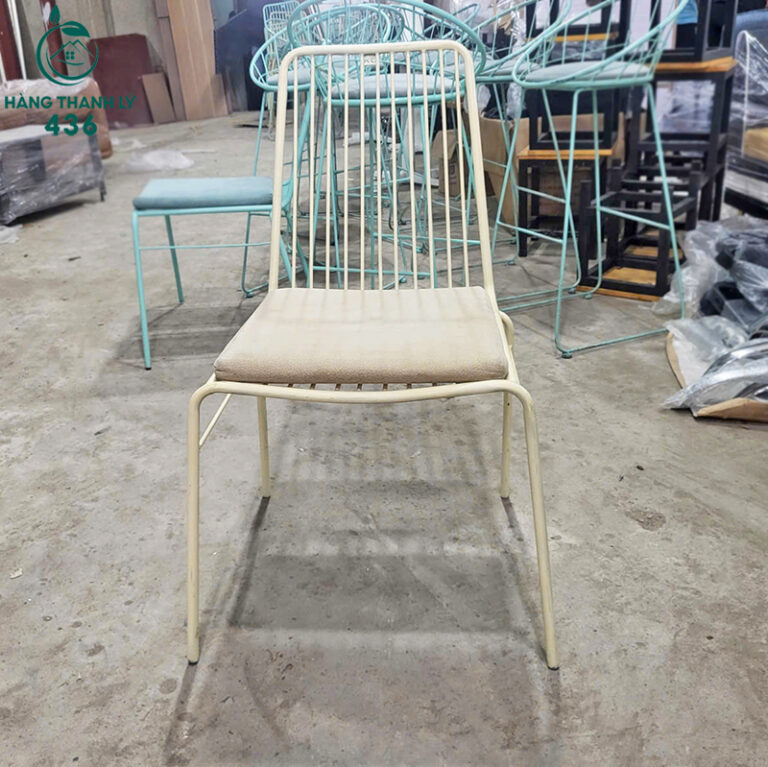 - Mô Tả: Chiếc ghế này mang thiết kế hiện đại với dáng thanh mảnh, lưng tựa nan thẳng cao tạo cảm giác thoáng đãng và giúp nâng đỡ cột sống tốt khi ngồi. Khung ghế làm từ kim loại chắc chắn, chịu lực tốt và bền bỉ theo thời gian. Phần đệm ngồi được bọc vải mềm mại, mang lại sự êm ái và thoải mái khi sử dụng lâu dài. Nhờ kiểu dáng gọn nhẹ, ghế dễ dàng di chuyển và sắp xếp, phù hợp cho nhiều không gian khác nhau như quán cà phê, nhà hàng, sân vườn hoặc dùng trong phòng ăn gia đình.