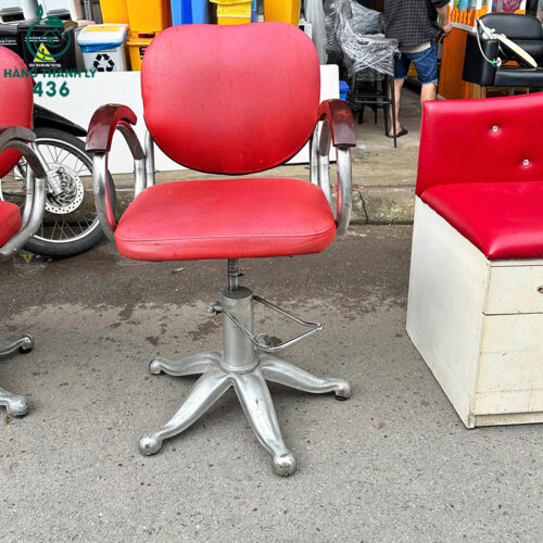 - Mô Tả: Đây là những chiếc ghế chuyên dụng cho tiệm cắt tóc, salon hoặc thẩm mỹ viện, rất cần thiết cho các chủ tiệm muốn mở quán với chi phí thấp. Ưu điểm lớn nhất là phần trục thủy lực chắc chắn, hoạt động tốt, giúp anh chị dễ dàng nâng hạ chiều cao ghế tùy ý, tiện lợi khi thao tác cắt hoặc làm tóc cho khách hàng. Đệm ghế bọc da Simili màu đỏ nổi bật, êm ái, tạo cảm giác thoải mái cho người ngồi và dễ lau chùi sau mỗi lần sử dụng. Tay vịn được bọc thêm lớp gỗ, tạo sự sang trọng và chống trượt.