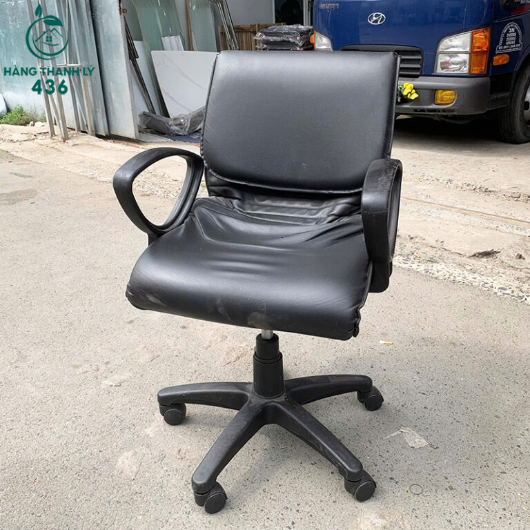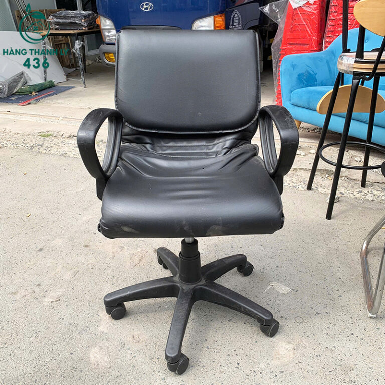 - Mô Tả: Chiếc ghế xoay lưng trung này là sự lựa chọn phổ thông và cực kỳ tiện dụng cho nhân viên hoặc học sinh. Thiết kế nhỏ gọn, không chiếm nhiều diện tích, nhưng vẫn đảm bảo sự thoải mái cần thiết khi ngồi làm việc. Ghế được bọc da Simili màu đen, dễ dàng phối hợp với mọi màu sắc nội thất và đặc biệt tiện lợi khi vệ sinh, chỉ cần lau nhẹ là sạch. Đệm ngồi và lưng tựa được may gấp nếp, tạo độ êm ái và không bị xẹp lún nhanh. Với cơ chế tăng giảm chiều cao và khả năng xoay 360 độ, chiếc ghế thanh lý này giúp bạn có một không gian làm việc tiện nghi với chi phí đầu tư rất thấp.