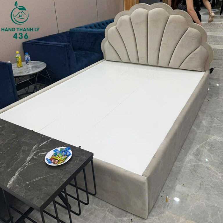 - Mô Tả: Chiếc giường bọc nệm này sẽ biến phòng ngủ của bạn thành một không gian nghỉ ngơi đẳng cấp và lãng mạn. Điểm nổi bật nhất là đầu giường được thiết kế theo hình vỏ sò (hoặc cánh quạt) với các múi nệm lớn, tạo nên sự mềm mại và quý phái. Giường được bọc lớp vải nệm màu kem/be trung tính, dễ dàng phối hợp với các đồ nội thất khác, mang lại cảm giác ấm cúng. Khung giường chắc chắn, đảm bảo độ bền cao và không gây tiếng động khi sử dụng. Sở hữu chiếc giường phong cách khách sạn 5 sao này với mức giá thanh lý là cơ hội không thể bỏ qua.