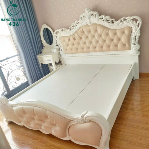 - Mô tả: Chiếc giường ngủ phong cách tân cổ điển nổi bật với phần đầu và đuôi giường bọc da màu kem nhạt, chần nút tinh tế, kết hợp khung gỗ trắng được chạm trổ hoa văn cầu kỳ, tạo nên vẻ sang trọng và quý phái. Kết cấu giường chắc chắn với bề mặt phẳng, dễ dàng lắp đặt nệm và vệ sinh. Chất liệu gỗ công nghiệp phủ sơn PU cao cấp giúp tăng độ bền, chống trầy xước và mối mọt. Thiết kế giường phù hợp với các không gian phòng ngủ rộng, biệt thự hoặc căn hộ cao cấp, đặc biệt thích hợp với người yêu thích phong cách hoàng gia hoặc lãng mạn. Ngoài công năng chính là nghỉ ngơi, chiếc giường còn đóng vai trò như một điểm nhấn nghệ thuật, nâng tầm đẳng cấp thẩm mỹ cho toàn bộ căn phòng.