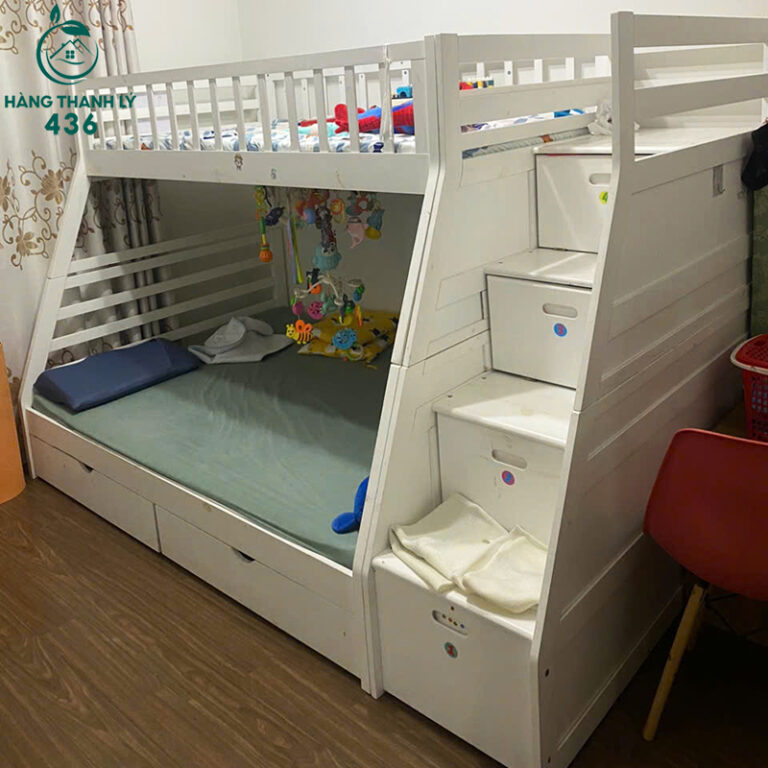 Mô Tả: Mẫu giường tầng trẻ em thanh lý còn mới khoảng 90%, form giường vuông vức, nước sơn trắng sáng dễ phối với nhiều không gian phòng ngủ. Thiết kế 2 tầng chắc chắn, tầng trên có lan can cao giúp bé ngủ an toàn, tầng dưới rộng rãi sử dụng thoải mái. Phần cầu thang liền khối tích hợp các hộc kéo bên trong, vừa làm bậc lên xuống vừa tận dụng để chứa đồ chơi, quần áo cho bé. Bên dưới giường còn có hộc kéo lớn, giúp phòng ngủ luôn gọn gàng, ngăn nắp. Phù hợp cho gia đình có 2 bé hoặc phòng ngủ diện tích nhỏ.