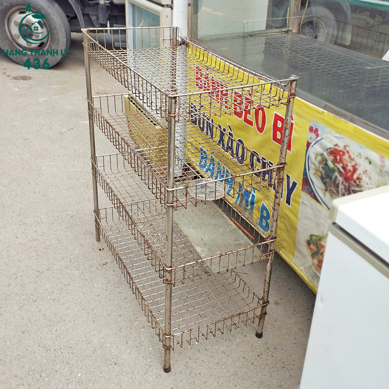 - Mô tả: Kệ sắt 4 tầng có thiết kế đơn giản, gọn gàng với kiểu dáng hình chữ nhật đứng, phù hợp đặt sát tường hay góc nhỏ để tối ưu không gian. Sản phẩm làm từ kim loại, tuy đã cũ nhưng vẫn chắc chắn, chịu lực tốt. Mỗi tầng là khung lưới hở giúp thoáng khí, dễ thoát nước, rất phù hợp để đựng thực phẩm, vật dụng nhà bếp, hàng hóa ở quán ăn hoặc chợ. Chân kệ có đệm cao su nhỏ chống trượt và bảo vệ sàn. Đây là lựa chọn tiết kiệm, tiện lợi cho người cần giải pháp lưu trữ hiệu quả trong diện tích nhỏ.