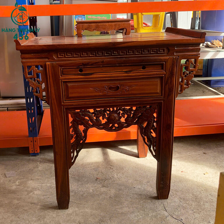Mô Tả: Chiếc bàn gỗ này được làm từ gỗ tự nhiên, nổi bật với các họa tiết chạm khắc thủ công rất tỉ mỉ, mang lại vẻ đẹp cổ kính và trang nghiêm. Bàn có một ngăn kéo nhỏ, tiện lợi để chứa các vật dụng cần thiết. Kích thước ngang 88cm phù hợp để đặt ở nhiều vị trí trong nhà, làm bàn thờ thần tài hoặc bàn trang trí phòng khách. Chất liệu gỗ tự nhiên đảm bảo độ bền vượt trội, không lo mối mọt hay cong vênh, tuổi thọ sử dụng lâu dài, giúp tiết kiệm chi phí cho gia đình bạn.