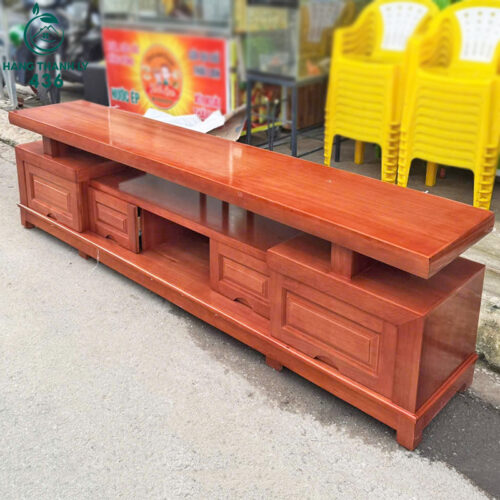 - Mô tả: Mẫu kệ tivi gỗ thiết kế kiểu để sàn, mặt trên rộng rãi, dễ bố trí trong các không gian phòng khách hoặc phòng trọ. Kệ có cấu trúc chắc chắn, gỗ dày và chịu lực tốt. Điểm nổi bật là có đến 4 ngăn kéo to nhỏ khác nhau, giúp người dùng đựng điều khiển, dây điện, sách báo gọn gàng. Phần dưới cùng thoáng, có thể đặt thêm đầu đĩa, loa hoặc vật dụng trang trí. Màu gỗ nâu đỏ bóng nhẹ, dễ phối hợp với nhiều loại nội thất hiện có.