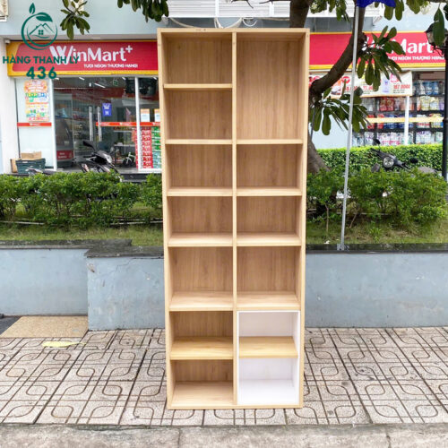 - Mô tả: Tủ trưng bày gỗ kiểu đứng với thiết kế dạng ô vuông chia thành nhiều ngăn tiện dụng, màu gỗ sáng tự nhiên tạo cảm giác ấm cúng và thoáng đãng. Tủ có một phần ngăn dưới màu trắng, tạo điểm nhấn độc đáo. Với kích thước vừa phải, sản phẩm phù hợp để bố trí trong phòng khách, phòng làm việc hoặc phòng ngủ, giúp sắp xếp sách vở và đồ dùng một cách gọn gàng. Ngoài ra còn có thể sử dụng được trong các tiệm spa, nail, tiệm tóc hoặc cửa hàng mỹ phẩm để trưng bày sản phẩm.