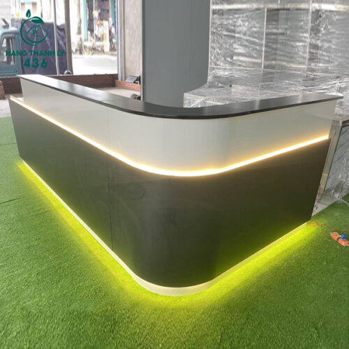 - Mô tả: Quầy chữ L hiện đại với mặt ngoài được phối hai màu tương phản trắng và đen, tạo nên vẻ đẹp sang trọng. Quầy được trang bị hệ thống đèn LED chạy dọc cạnh viền, tạo ánh sáng nổi bật, thích hợp cho không gian quầy lễ tân, showroom hoặc các khu vực giao dịch. Thiết kế bo góc mềm mại, kết hợp với ánh sáng đèn LED màu vàng, tạo điểm nhấn thu hút và giúp không gian thêm phần ấm cúng, chuyên nghiệp. Quầy có mặt rộng, tiện dụng cho việc sắp xếp và giao tiếp khách hàng.