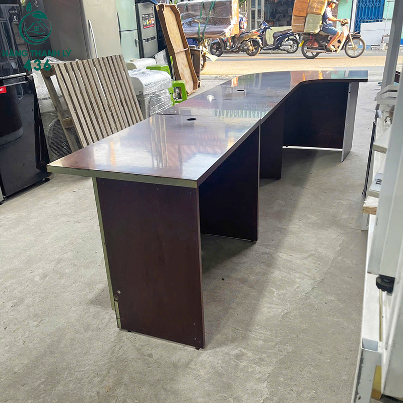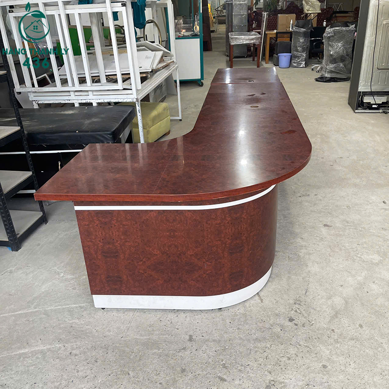 Mô Tả: Quầy lễ tân thiết kế dáng cong hiện đại với kích thước dài, phù hợp sử dụng cho văn phòng công ty, spa, showroom hoặc cửa hàng dịch vụ. Mặt quầy rộng rãi giúp bố trí máy tính và hồ sơ làm việc thuận tiện. Chất liệu gỗ công nghiệp MDF chắc chắn, bề mặt phủ màu nâu sang trọng và dễ vệ sinh. Sản phẩm còn sử dụng tốt, kết cấu ổn định và đáp ứng nhu cầu sử dụng lâu dài.