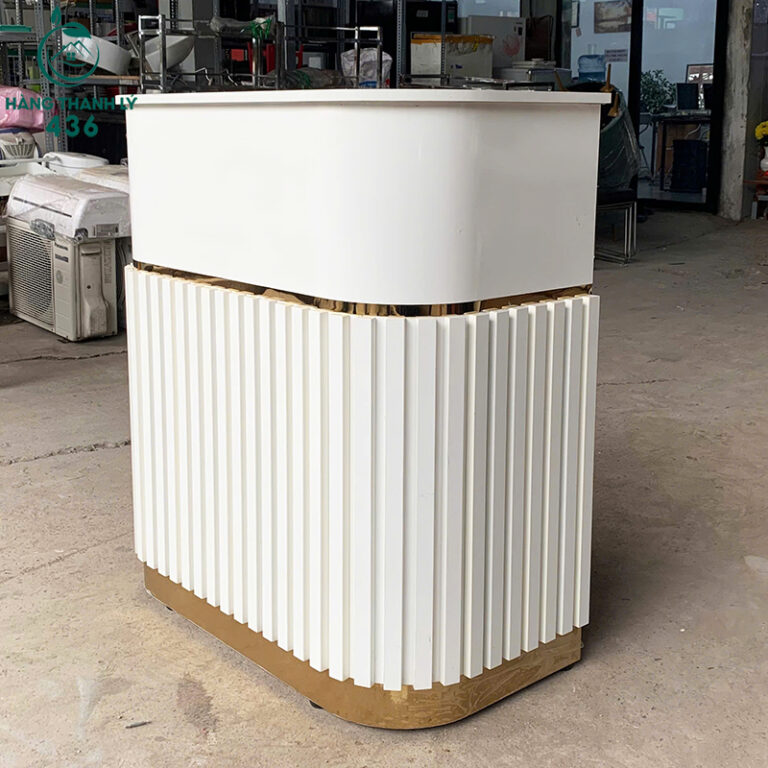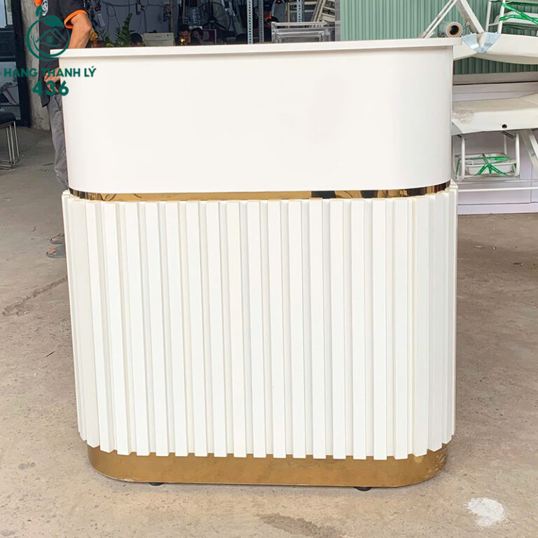 Mô Tả: Chiếc quầy lễ tân thanh lý này là điểm nhấn hoàn hảo cho không gian văn phòng, cửa hàng hoặc spa của bạn. Thiết kế hiện đại với các góc bo cong mềm mại và họa tiết sọc đứng, kết hợp màu trắng tinh tế cùng viền vàng đồng sang trọng, tạo nên sự chuyên nghiệp và thu hút ngay từ cái nhìn đầu tiên. Đặc biệt, quầy được trang bị đèn LED nổi bật, giúp khu vực đón tiếp luôn sáng và chuyên nghiệp.