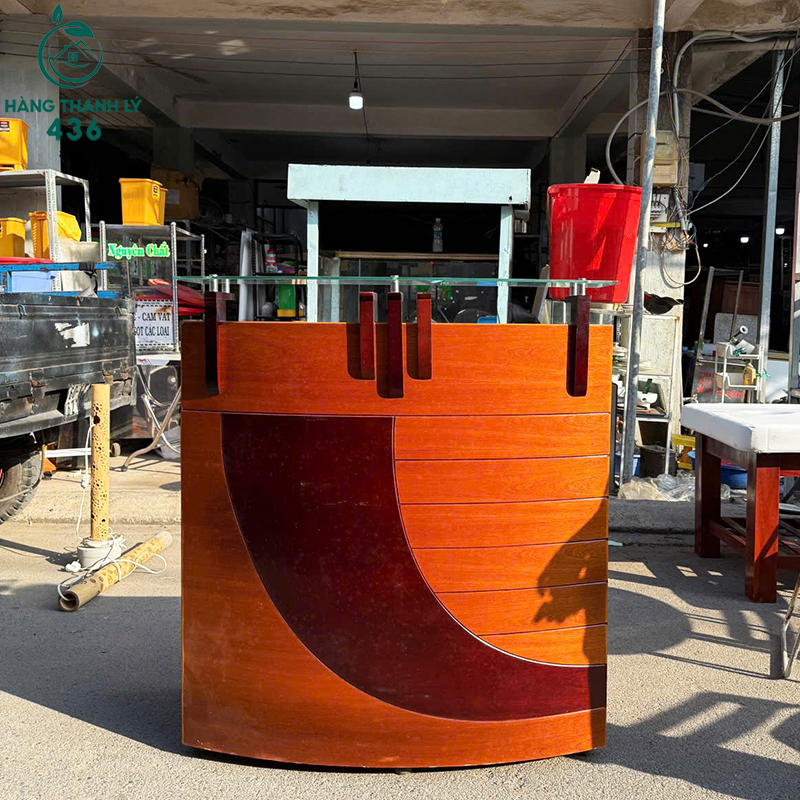 Mô Tả: Mẫu quầy lễ tân gỗ thiết kế hiện đại, kiểu dáng cong nhẹ phía trước tạo điểm nhấn cho khu vực tiếp khách. Mặt trên lắp kính cường lực giúp bề mặt sử dụng sạch sẽ, dễ lau chùi và tăng tính thẩm mỹ. Bên trong quầy được bố trí hộc tủ và khoang trống, thuận tiện cất giữ hồ sơ, sổ sách và vật dụng làm việc hằng ngày. Chiều cao quầy phù hợp cho việc đứng tiếp khách hoặc ngồi làm việc bên trong. Kích thước gọn gàng, dễ bài trí ở sảnh spa, văn phòng, showroom hoặc cửa hàng kinh doanh. Sản phẩm đã qua sử dụng nhưng còn mới khoảng 90%, hình thức đẹp, sử dụng ổn định.