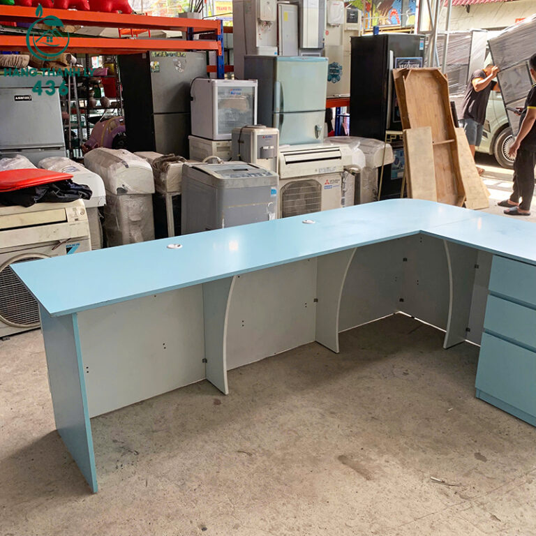 Mô Tả: Quầy lễ tân cũ thiết kế hiện đại, màu xanh lam tươi sáng giúp tạo không gian làm việc năng động. Với mặt bàn phẳng, bạn có thể dễ dàng đặt máy tính, tài liệu và các thiết bị văn phòng khác. Quầy được làm từ chất liệu gỗ công nghiệp bền đẹp, chịu lực tốt, phù hợp cho các văn phòng hoặc khu vực tiếp khách. Sản phẩm còn mới khoảng 90%, dễ dàng lắp đặt và tiết kiệm chi phí so với mua mới.