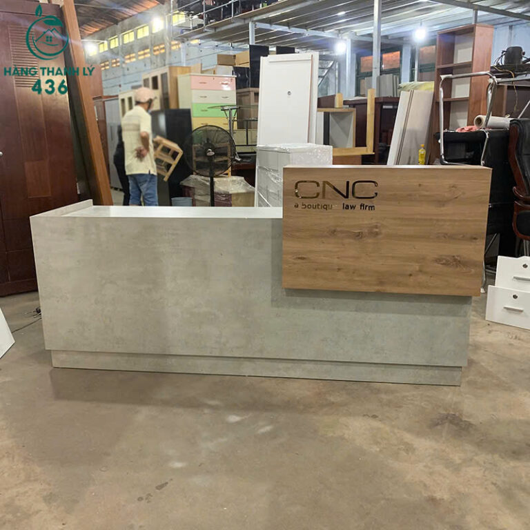 - Mô Tả: Chiếc quầy lễ tân này mang phong cách hiện đại, tối giản, rất phù hợp với các văn phòng, công ty luật hoặc showroom. Thiết kế nổi bật với mặt ngoài dán Melamine giả vân xi măng (hoặc vân đá mài) màu xám, tạo cảm giác chuyên nghiệp, cá tính. Phần mặt quầy tiếp xúc được ốp vân gỗ nâu, tạo điểm nhấn ấm áp và sang trọng. Bên trong, quầy được trang bị mặt bàn rộng rãi cho nhân viên làm việc, có hộc tủ kéo tiện lợi để cất giữ sổ sách, giấy tờ và vật dụng cá nhân. Đặc biệt, quầy có kệ gỗ nổi phía trên, lý tưởng để trang trí hoặc đặt máy POS/điện thoại bàn.