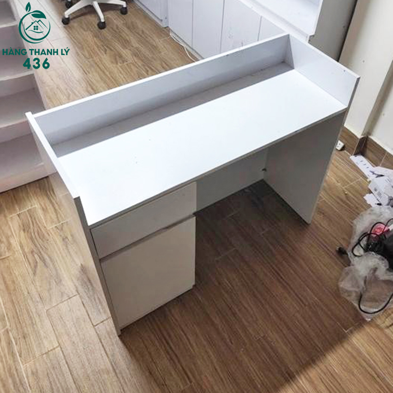 Mô Tả: Quầy thu ngân cũ làm từ gỗ công nghiệp sơn trắng, gồm tủ đóng và ngăn kéo tiện lợi, mang lại không gian làm việc gọn gàng cho cửa hàng, quán cafe hoặc văn phòng. Mặt bàn rộng, chắc chắn, giúp thao tác thanh toán dễ dàng và thuận tiện sắp xếp vật dụng. Sản phẩm còn mới 90%, thiết kế hiện đại, gọn gàng, dễ kết hợp với nội thất khác. Đây là lựa chọn lý tưởng cho những ai muốn trang bị quầy thu ngân chất lượng mà tiết kiệm chi phí so với quầy mới.