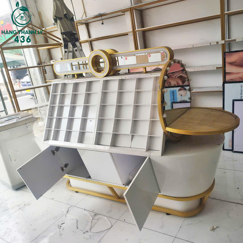 Mô Tả: Mẫu quầy trưng bày shop cũ này có thiết kế bo cong mềm mại, nhìn rất sang và dễ tạo điểm nhấn cho không gian cửa hàng. Phần kệ trên chia nhiều ô nhỏ giúp trưng bày mỹ phẩm, phụ kiện hoặc sản phẩm mẫu gọn gàng, dễ nhìn. Bên dưới là hệ tủ kín để đồ dự trữ, giúp shop luôn gọn gàng khi bán hàng. Kiểu quầy này phù hợp đặt giữa shop hoặc sát tường đều đẹp, đặc biệt hợp với cửa hàng mỹ phẩm, spa, showroom trưng bày. Hàng còn mới khoảng 90%, form chắc chắn, mua về là dùng ngay không cần sửa chữa nhiều.