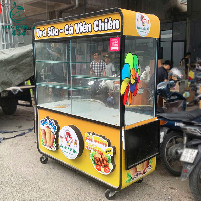- Mô tả: Xe bán hàng cũ được thiết kế dạng tủ kính 3 tầng, giúp trưng bày thực phẩm rõ ràng, sạch sẽ. Phần khung xe làm từ sắt sơn chống gỉ, có bánh xe đẩy linh hoạt, tiện cho việc di chuyển tại vỉa hè, trước cổng trường hoặc khu dân cư. Phía mặt trước có decal in hình đẹp mắt, thu hút khách. Tủ còn tương đối chắc chắn, kính không nứt vỡ, dùng tốt. Phù hợp mở bán ăn vặt, nước uống hoặc thay đổi mục đích sử dụng tùy ý.